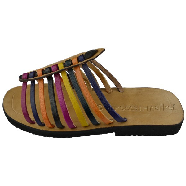 Sandales à bout rond et ouvert, au cuir finement travaillé et aux découpes originales. Fabriqués dans un petit atelier familial près de la ville d'Essaouira, ces nu-pieds sont hautement confortables, pratiques et parfaits pour vos vacances. Ces lanières multicouleurs et entremêlées sauront accessoiriser toutes vos tenues estivales.